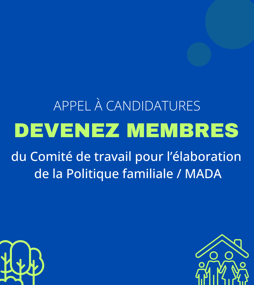 La Politique familiale / MADA servira de guide pour orienter les décisions municipales et définir des actions concrètes en faveur des familles et des personnes aînées. Elle visera à offrir des services accessibles et équitables, adaptés à leur réalité et à leurs besoins, afin d’améliorer leur qualité de vie.