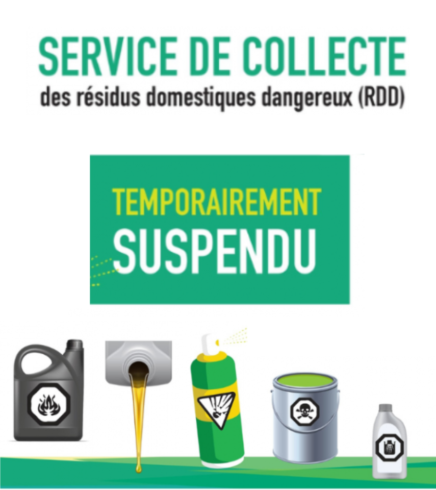 La collecte des résidus domestiques dangereux (RDD) est suspendue temporairement à l’écocentre jusqu’à nouvel ordre. Il est demandé de conserver ces résidus à domicile pendant quelques semaines, le temps que les contenants d’entreposage puissent être pris en charge.