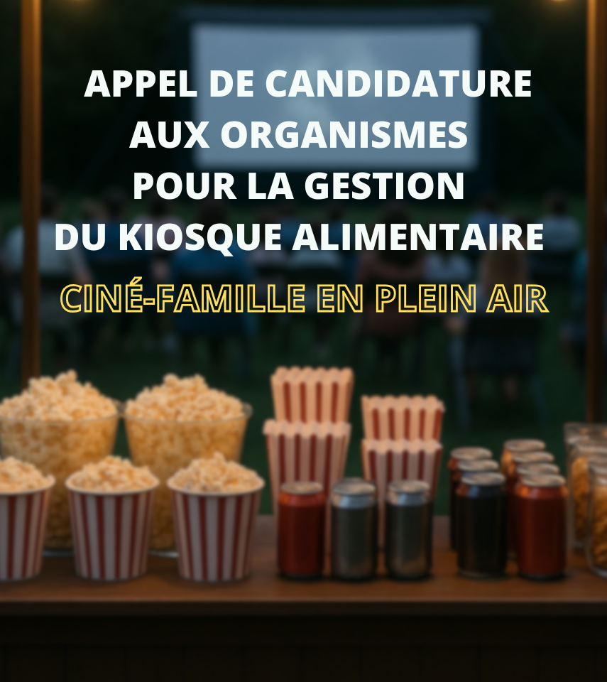 Pour bonifier son offre de service lors des soirées de ciné-famille en plein air prévues cet été, la Ville lance un appel aux organismes à but non lucratif de la région intéressés à assurer la vente de produits alimentaires sur le site des événements.